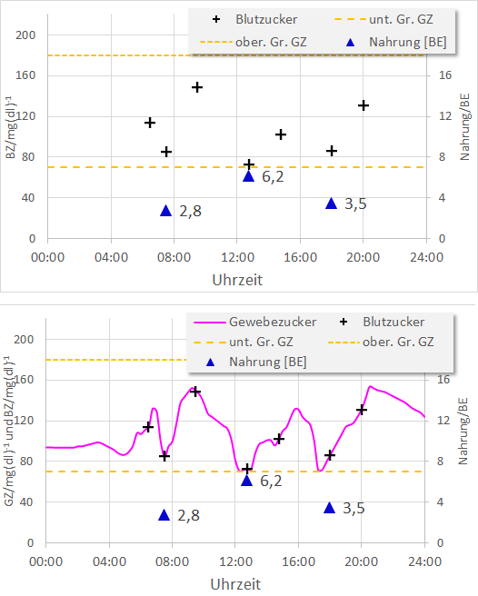 Über viele Jahrzehnte konnten Diabetiker und ihre behandelnden Ärzte die Therapie zum Beherrschen der Krankheit (die unheilbar ist) lediglich auf punktuell ermittelte Messungen der Glukosekonzentration im Blut ausrichten (vgl. Bild oben).