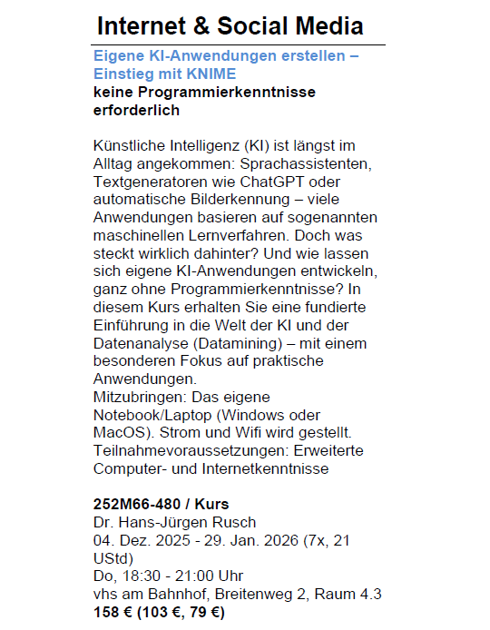 Um dieses spezielle Know-how nutzbar zu machen, sollten sich Fachingenieure Zusatzwissen im Datamining/ML aneignen. Und genau deshalb biete ich mein Wissen in einem VHS-Lergang an.